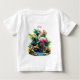It features a vibrant pink flamingo standing gracefully in a small pond surrounded by lush green foliage and colorful flowers. The design, set against a white background, can be personalized with your baby's name, making it a unique and charming accessory.