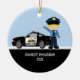 This is a cute Policeman. He is dressed in a blue policeman's uniform. He has blonde hair and has one arm raised. He's standing next to a black police car. The top has a light blue background while the bottom is black with a thin white border. Personalize to make it special! Check out our many other designs! ©scrappindoodles