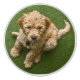 Adorable fluffy puppy sitting on a lawn, photograph taken from above.