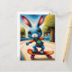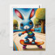 AI generated art of an adorable skateboarding rabbit wearing a colorful striped shirt with storybook style trees in the background