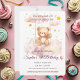 Celebrate your baby girl’s special day with this adorable teddy bear birthday invitation! Featuring a sweet watercolor bear swinging among pastel clouds and golden stars, this design is soft, whimsical, and fully customizable. Personalize with your child’s name, party date, location, and RSVP info. A perfect first birthday invite to match our full teddy bear party collection!