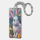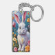 Adorable White Bunny Surrounded by Vibrant Flowers Keychain
