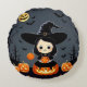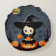 A cute cartoon witch surrounded by glowing pumpkins and bats under a Halloween moonlit sky. Perfect for seasonal decorations, children’s themes, or magical holiday vibes.