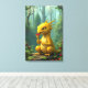 A small, adorable yellow dragon with spiky scales is sitting on a log in a lush forest, eating berries. Digital art for children.