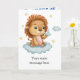 Sweet image on a custom birthday, new baby, or baby shower card with a cute lion cartoon sitting on a cloud. Click on "Personalize this template" to customize the card with your message on the front and the inside. You can also delete the sample text and write your own message in later.