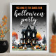 Welcome your guests in style with this spooky yet simple party sign! Featuring the text "Welcome to the [Your Name] Halloween Party" on both the front and back, the design uses a handwritten script calligraphy paired with a grunge sans serif font for a hauntingly stylish look. The black and white color scheme highlights a haunted house at the center, accented with pops of orange from pumpkins, jack-o'-lanterns, and eerie trees. Playful ghosts and bats add a whimsical touch, making this sign perfect for setting the tone of your Halloween celebration with a vintage charm. Ideal for greeting guests at the door and creating a fun, festive atmosphere!