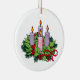 Front: An illustration of an Advent wreath made of evergreens and holly with all four candles lit... The four candles represent and are lit on the four Sundays of Advent—the pink candle, the third; the three violet ones, the first, second, and fourth. The three violet candles symbolize hope, peace, and love; the pink candle, joy. + Back: A seasonal wish incorporating the themes of the four weeks of Advent: hope, peace, joy, and love, + Image Credits: Black and white Advent wreath AI-generated by mimicoloringdesigns via Pixabay, modified and colorized by Saints_Aplenty; bow by Elionas also via Pixabay.