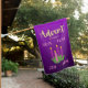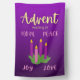 This special Advent flag features the four traditional weekly themes of Advent: Hope, Peace, Joy, and Love, surrounding a fully lit Advent Wreath, on a purple gradient background. Designed by a Catholic wife and mother.