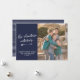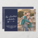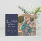 A fun family New Year's photo card perfect if you missed the Christmas card boat! This design features the phrase 'the adventure continues' in a white hand lettered style script font underlined with a hand drawn white arrow, and your personalized greeting underneath. On the right, place your favorite family photo. The back of the card features a pattern of white stripes, and the overall background color of the card is navy blue..