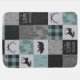Woodland themed patchwork blanket in greys, aqua, and black.