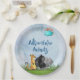 Paper plates which says adventure awaits. Set on a light blue watercolor background. A blue cloud and an orange sun sit in the sky. A meerkat, gorilla and hippo all together on some savannah grasses, about to embark on some adventure.