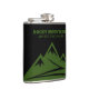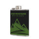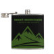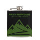 Adventure Awaits Rocky Mountains logo custom drink Flask. Add your own personalized text or funny quote. Green Colorado mountain peak logo with hiking trail. Custom hip flask for drinks. Manly Birthday gift for people who love hiking, camping, outdoors, nature etc. Unique gifts for friends, family, coworker, colleague, dad, husband and others.