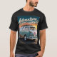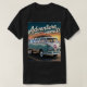 A photo-realistic style of a classic Volkswagen Kombi driving on a coastal road at sunset, with the words 'Adventure Awaits' written in a cursive portrait source above the scene. The Kombi must have a painting faded by the sun and subtle details of rust, with realistic reflections of the sunset in its windows. The bottom should show the ocean, cliffs and palm trees, with a worn texture over the entire design to give an aging, vintage look.