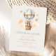 This cute baby shower invitation postcard features a sweet watercolor teddy bear in a blue and white striped hot air balloon, above the words "Adventure awaits!" in dusty blue retro script. Personalize the text with the name of the mom-to-be in script and the details in sans serif font on a beige background.