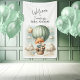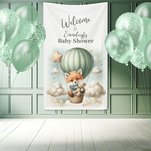 Captivating "Let the Adventure Begin" themed baby shower invitation with an adorable fox holding a teddy bear riding in a green hot air balloon. The watercolor green sky has white clouds with surrounding gold stars. White star pattern on dark green background on the back of invite. Templates provided.