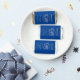 Travel theme chocolate mini candy bar favors with navy blue and gold "Passport Cover" design and "the adventure begins" quote with personalized name text, perfect for destination wedding favors or travel theme bridal and baby showers and parties.