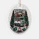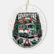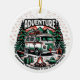 Celebrate the holidays in the great outdoors with this vibrant retro-style Adventure Camper Van ornament. Featuring a classic camper van adorned with Christmas lights, a wreath, and camping gear, this festive design is set against a backdrop of snowy mountains and lush decorated trees. A cozy campfire and camping essentials like logs and an axe complete the scene, making it perfect for outdoor enthusiasts who love to embrace adventure during the holiday season. The playful lettering "ADVENTURE" stands tall at the top, while "Celebrate the Holidays in the Great Outdoors" wraps around the bottom edge.