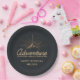 Personalized birthday paper plates with a gold colored illustration on a black-gray background. Designed with an illustration of a mountain with the suns rays shining outward from behind. Typography says: Adventure explore dream discover.
