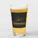 Drinking glass with a gold colored illustration on a black-gray background. Designed with an illustration of a mountain with the suns rays shining outward from behind. Typography says: Adventure explore dream discover.
