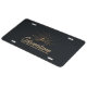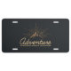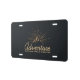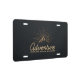 A license plate with a gold colored illustration on a black-gray background. Designed with an illustration of a mountain with the suns rays shining outward from behind. Typography says: Adventure explore dream discover.