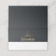 Folded place card with a gold colored illustration on a black-gray background. Designed with an illustration of a mountain with the suns rays shining outward from behind. Typography says: Adventure explore dream discover.