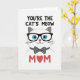 This card features a stylized cat’s head centered on a bright white background, drawn with smooth lines and a soft white coat with gently shaded gray ears. The cat gazes forward with bright blue eyes behind thick black-rimmed glasses, giving it an endearing, attentive look that feels like a fond nod between close friends ❤️. A tiny pink nose and fine whiskers add a sweet, affectionate touch, and a black bow tie with small white dots sits neatly under its chin like it dressed up just for someone special. Near the top, the phrase “YOU’RE THE CAT’S MEOW” appears in rounded black letters, spaced evenly above the cat’s ears. Below the portrait, the word “MOM” is set in warm red, and the “O” is replaced with a small heart shape 🌼. The overall palette sticks mostly to black, white, blue, and red, keeping the design simple while still feeling cozy and romantic. The heart icon sits centered in the red word beneath the bow tie, standing out clearly against the white space.