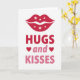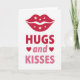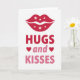 This card shows a pair of ruby-red lips at the top, shaped like a kiss and decorated with five small white stars across them. The lips look glossy and confident, like they’re sending a sweet kiss right off the page. Below, the text reads “HUGS and KISSES,” centered on the white background. “HUGS” is in red letters, while “and KISSES” is in a softer pink, so the message feels warm and gentle. Two tiny red hearts sit on either side of the word “and,” like little reminders of love. The simple white space around everything keeps your attention on the kiss and the message, making it easy to read at a glance. It’s a meaningful card to give because it says what you feel in a direct, caring way—perfect for a partner or a close friend 🥰❤️.