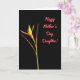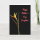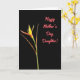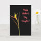 This card features a single elegant flower set against a deep black background, creating a quiet, intimate stage for the design. From the lower left, a slender green stem rises with warm yellow-orange petals that feel like they’re leaning in with gentle affection ❤️. At the base, a reddish-brown, boat-shaped sheath cradles the bloom, adding an earthy touch that suggests steady care. Two narrow reddish-brown leaf forms extend nearby, like soft companions framing the stem in a calm, supportive way. In the upper right, the message “Happy Mother’s Day, Daughter!” appears in flowing coral-pink lettering, standing out clearly against the dark space 🌼. The lighting is smooth and even, showing fine textures in the petals and sheath without harsh shadows. The coral-pink words sit high and right while the flower anchors low and left, leaving plenty of black space between them. The petals glow yellow-orange above the reddish-brown sheath, with the green stem angled upward from the lower-left corner.