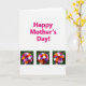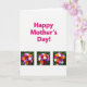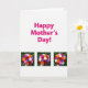 The front design shows a bright white background with the words “Happy Mother’s Day!” placed across the upper area in fuchsia lettering that stands out right away. Beneath the text, three matching photo-style panels sit side by side, creating a neat row that feels like a shared moment captured more than once ❤️. Each panel shows a close-up of a round bouquet being gently held in one human hand, with the careful grip suggesting a tender, giving gesture between loved ones. The flowers form a dense sphere of mixed blooms in deep red, orange, soft pink, white, and violet, clustered tightly so the colors mingle like a warm embrace. Behind the bouquet in every panel, the background fades into a soft-focus wash of green leaves that hints at an outdoor garden setting. The repeated arrangement across the three panels adds a calm, balanced look, like someone pausing to admire the same caring gift from different glances 🌼. The lower half of the card is filled by the trio of bouquet images, each framed against the same blurred greenery with the hand entering from the lower edge.