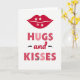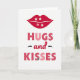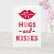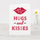 This greeting card shows a bright white background with a pair of classic red lips at the top, shaped in a simple, stylized way. Around the lips are four small stars—two white above and two below—with one of the lower stars in a soft pink. Under the lips, the words “HUGS and KISSES” are centered and easy to read. “HUGS” and “KISSES” use thick, sans‑serif letters filled with red-to-pink color shading, and there’s a light shadow that makes the words stand out. The word “and” sits between them in a darker red, written in a flowing letter style that looks like quick pen writing. A small black flourish replaces the dot over the “i” in “KISSES,” adding a sweet little detail. It feels meaningful because it’s simple, direct, and says exactly what you want to give someone—warmth, closeness, and affection 🥰❤️.
