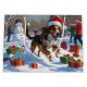 A heartwarming holiday illustration featuring a cheerful dog playing in the snow, wearing a Santa hat and surrounded by colorful gift boxes. In the background, children build a snowman beside a snow-covered Christmas tree, creating a joyful winter wonderland. Perfect for spreading holiday cheer and capturing the magic of Christmas.