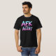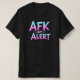 The image displays the text "AFK BUT ALERT" in a bold, vibrant font with a neon-like appearance. The word "AFK" is at the top in bright pink with blue highlights, while "BUT" is in smaller, handwritten-style white text, emphasized with cyan and pink dashes on either side. The word "ALERT" is at the bottom in a similar style to "AFK," featuring a gradient of pink and blue. The background is black, making the colors pop, with faint circular glow effects adding a dynamic, illuminated effect.