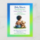 Boy's Baby Shower Invitations. Cute little African-American baby boy with a teddy bear blue and green baby shower.