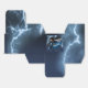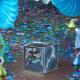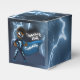 A young superhero in a proud stance. A gradient of blue is used in the background. A cute design for the theme of the party and a great way to thank everyone for attending a special boys' birthday.