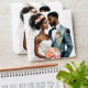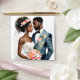 Watercolor artwork features a beautiful brown-skinned couple as bride and groom. This melanated item has a peach and coral color scheme with floral accents.