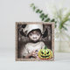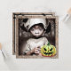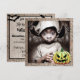 Creepy Halloween party invitations. Strange child with big scary eyes and a pumpkin spooky invite.