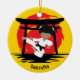 This cute, personalized Karate girl Christmas ornament features a cool black little girl performing a kick in front of a paifang. Customize this fun custom African American kids gift with your child's name in black under the Chinese gate. Great yellow and red design.