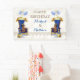 Vintage babies sitting on velvet thrones with a banners that have customizeable text with a bouquet of balloons tied to the chair & gold present. Use for twin boys birthday or baby shower.