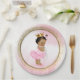 Princess baby shower paper plates with adorable princess baby girl wearing a pretty pink tutu and string of pearls on a beautiful pink and gold background. These cute princess baby shower paper plates are easily customized with text.