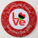 Personalized button pin with the word "LOVE", in red letters with an African American heart shaped flag for the "O". Wonderful way to share your pride and love in the Black American culture, heritage and ancestry. Also known as the flag of the African Diaspora. Design shows within a white fractal circle on a red fractal background. Can be personalized with name, year and holiday. Fun Valentine's Day party favor gift.