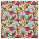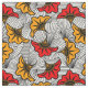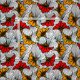 Traditional African ankara style patterned fabric, wth red and gold biloba flowers over a black and white geometric background