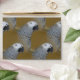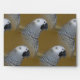 Stunning Congo African Grey Parrot perched up high showing all her beautiful grey scalloped feather edges with a taupe, beige, brown, or mustard colored background. Perfect for the bird lover in you!