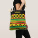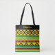 Colourful, bold patterned tote bag featuring a traditional African kente style geometric pattern in bright yellow, red, green and black. There's a custom text area on the front to add a name or message