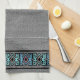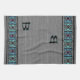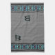 The fun modern retro design featured on this cool woven cotton kitchen towel depicts a wide top and bottom borders of a traditional African border pattern (in black, medium blue, aqua, mauve, pinkish-gray & olive green-gray) sandwiched between 2 narrow black stripes, set against a medium gray canvas pattern. Above bottom border is a large custom text field to personalize with your monogram. Also great for guest hand towels.