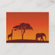 African safari landscape background featuring silhouettes of a giraffe, a tree and an elephant against the sunset in orange and red color shades.