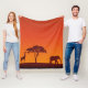 African safari landscape background featuring silhouettes of a giraffe, a tree and an elephant against the sunset in orange and red color shades.