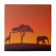 African safari landscape background featuring silhouettes of a giraffe, a tree and an elephant against the sunset in orange and red color shades.