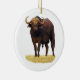 Photo of a Full size african Water buffalo standing on a patch of dried grass