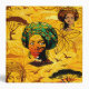 My Design features a stylized portrait of a Beautiful African woman wearing a colorful headwrap. The headwrap is adorned with green and yellow leaf patterns. Her face is filled with a sunset silhouette, complete with birds flying across the sky and a landscape with trees. She wears large, ornate earrings and a beaded necklace. Original Pop Art Style Vector Illustration Copyright BluedarkArt TheChameleonArt.