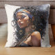 This throw pillow showcases the captivating beauty of an Afrocentric woman, complete with ornate jewelry and a headscarf, set against a watercolor backdrop. A statement piece for any room, it celebrates beauty and culture.